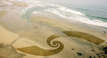 Jim Denevan works with the earth, including the sand in deserts and on beaches, where his painstakingly drawn patterns are certainly doomed to disappear with wind and tides. But they are beautiful to behold, and we can see in his photographs that it’s a slow and arduous process requiring intense concentration as well as physical strength and stamina. The artist creates gigantic spirals, and concentric rings of circles within circles, like dancing mandalas. Indeed, Denevan likens his compositions to music and dance because of their ephemeral and temporary nature. His materials are sand, earth, grass, ice, snow, water, and fire, and his “drawings” are made in large open areas with simple tools. Denevan’s work has received national and international recognition, in exhibits, commissions, and in film and television.