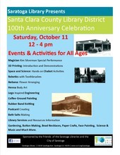 Celebrate the 100 Year Anniversary of the Santa Clara County Library District at the Saratoga Library! The event will be held on Saturday, October 11, from 12-4 p.m. The event will bring residents of all ages together for an enjoyable day of learning, creating, and connecting. It will include presentations as well as hands-on learning opportunities for all ages such as ones regarding: technology, arts-and-crafts, gardening, history, literature, health, the Bookmobile, library resources and services, and more. This event will be spread throughout the library, including in the Children's Department, in the Teen Area, in the Community Room, and more. Community partners will have tables at the event. This celebratory event will showcase the impressive history of the library system as well as the innovative community center that the library is today in its 100th year. We look forward to seeing you on October 11!The event includes: