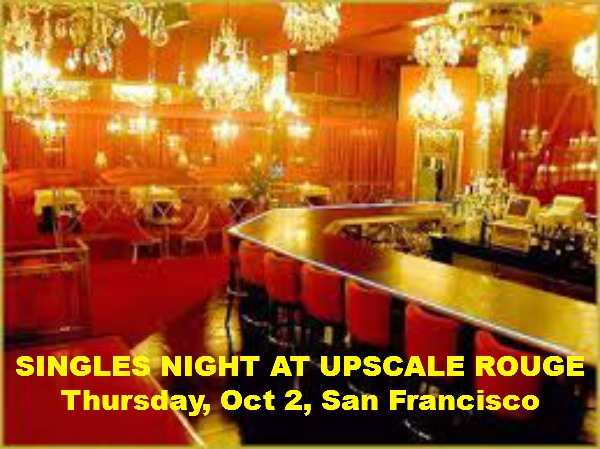 Only $10 at the door includes a FUN Mixer Game, which makes it EASY to meet people; accompanied by appetizers, served at 7pm, as long as they last. Adults of all ages welcome. Dress to impress! Thursday, October 2, 2014, 7-9pm.LOCATION: Rouge, 1500 Broadway at Polk, San Francisco CA 94109.