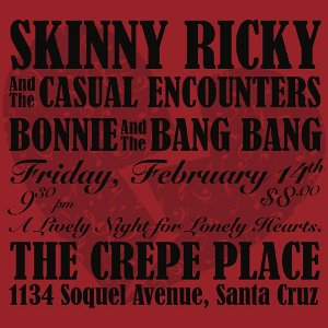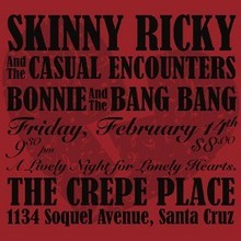 Come on down to the The Crepe Place as they present a double bill featuring Skinny Ricky & the Casual Encounters and Bonnie & the Bang Bang. Based out of Santa Cruz, Skinny Ricky & the Casual Encounters plays nothing but classic soul and R&B music, delivered with brass instruments and female backup singers. Bonnie & the Bang Bang is a San Francisco Bay Area-based group that creates aggressive indie-folk music, and have performed at some major festivals and venues, including BottleRock Napa Valley, Live105's "BFD," and the America's Cup Pavilion.