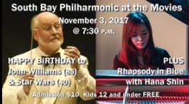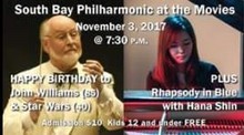 Join us as South Bay Philharmonic celebrates Happy Birthday to John Williams (85) and Star Wars (40). The 65+ piece orchestra will fill our hall with some of your favorite movie music, plus an added bonus of Rhapsody in Blue with Hana Shin on piano.