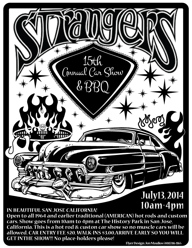 You are invited to attend the 15th Annual Strangers Car Show & BBQ. Enjoy the day viewing traditionally styled hot rods and customs, cooking up some BBQ with your friends, and checking out all of the original art and artists in vendor row.This show is open to all 1964 and earlier American made hot rods and customs. $20 per car. We do not pre-reg, it's first come first served. Please, no motorcycles or muscle cars.