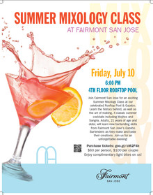 Fairmont San Jose is hosting a Summer mixology class at their Rooftop Pool & Gazebo. Learn the history behind, as well as the art of making, 4 classic summer cocktails including Mojitos and Sangria.Adults, 21 years of age and older, will learn new bartending skills from Fairmont San Jose's Gazebo bartenders as they make and taste their own creations.
