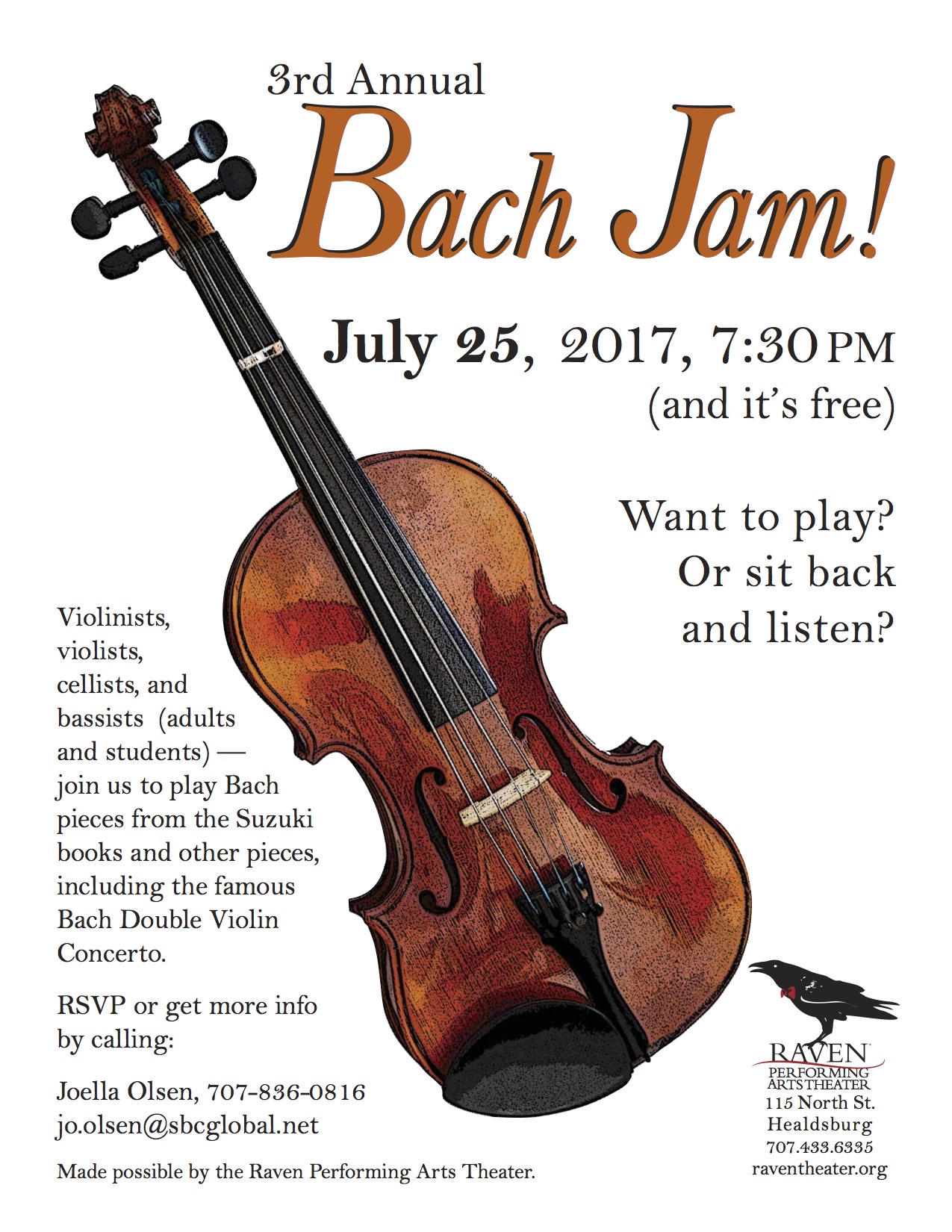 Join us to play Bach pieces from the Suzuki books and other pieces, including the famous Bach Double Violin Concerto.
