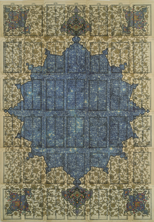 Ala Ebtekar’s artwork is influenced by his Persian heritage. Through this body of work, he envisions what the present could look like if it collided with history and mythology. Ebtekar asks the question, "What do Iranians and those in the diaspora see the future holding for them?" He explores the concepts of alternate realities, space and utopia against the backdrop of photographs of the famous Tomb of Hafez located in Shiraz, Iran and actual book pages from the poet Hafez’s revered collection of works, the Divan-e-Hafez.More Info