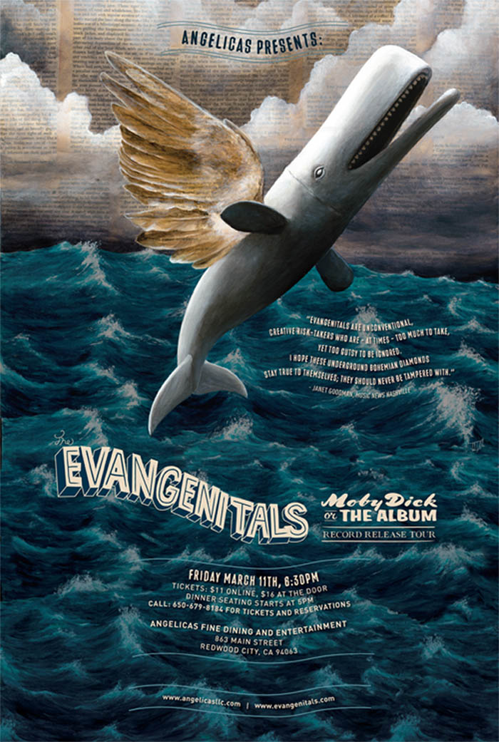 Moby Dick: or, The Album, The Evangenitals debut with Fluff & Gravy Records, doesn't come out officially until March 18th. However, lucky patrons who come to see the band at Angelicas in Redwood City on Friday March 7th will be able to get their hands on advanced copies of the epic new record, and hear the songs from the album performed live.The record itself is a musical swirl of immaculately crafted songs, each interpreting an aspect of Melville's masterpiece with an approach that tacks between intricate arrangement and the deceptively simple country-inflected tunes for which the band is best known. At times the songs are lushly poetic, at others, coarsely powerful. Joined by such notable guest artists as: folk legend Jim Kweskin (of Jug Band fame), acclaimed avant-garde performer Dorian Wood, and composer Jeremy Zuckerman ('Avatar: The Last Airbender' and recent #1 iTunes Soundtrack 'Legend of Korra'), among others, the band has crafted a timeless record that will resonate equally with fans of the classic Melville novel, and those who have yet to discover it.