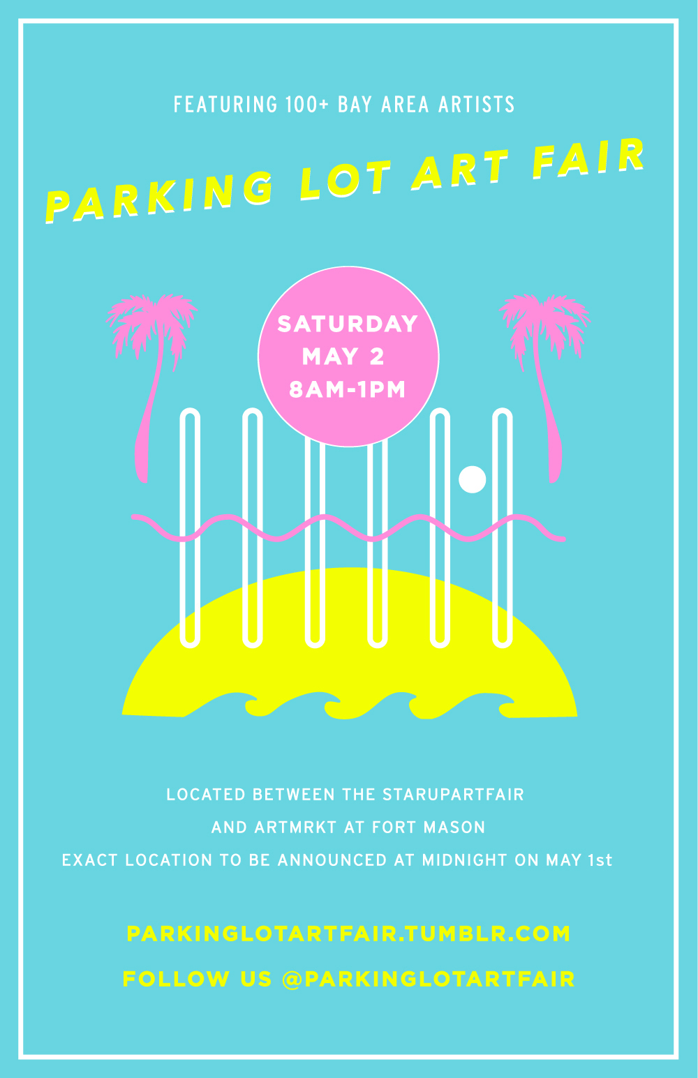The Parking Lot Art Fair is pleased to announce its inaugural event, taking place in a parking lot in San Francisco on Saturday, May 2nd from 8 AM to 1 PM. On this Saturday morning over 100 artists will converge on a parking lot in San Francisco, not far from the stART Up Art Fair and Art Market, and set up their own independent projects to form the Parking Lot Art Fair. The Parking Lot Art Fair is a renegade, DIY, artist-driven fair/happening. This fair will ask for no entrance fee for participants or patrons, and take no percentage of artist profits. The location of this art fair will be announced the evening before the fair through Parking Lot Art Fair’s social media channels.San Francisco has a history of attracting critical and diverse voices, and the Parking Lot Art Fair celebrates this spirit by providing artists a platform to exhibit their work to a wide audience of morning joggers, avid fair goers, and public space users. This fair will provide a space for diverse artistic practices, from tailgating performances to white cube exhibition spaces, the Parking Lot Art Fair presents a democratic platform for any and all artists of San Francisco. Artists, collectives, and projects who will participate include Diego Villalobos and Rene Esteban Franco of 1038, Alyssa Block, Amanda Hughen, Amy Cella, Andrew Eargle, Andrew Witrak, Anika Ahlberg, Annie Vought and Hannah Ireland of Double Zero, Anthony Discenza, Barbara Obata, Basement, Becky Ebeling, Becky Johnson, Brett Walker, Carey Lin, Carlos Franco Maldonado, Carrie Katz, Cathy Lu, Charlie Leese, Chelsea Pegram, Chelsea Wills, Chris Lux, Cléa Massiani for Bass & Reiner, Christian ‘Dicky’ Davies, Collin McKelvey, Courtney Johnson, David Bayus, Dorian Katz, Elise McMahon of LIKEMINDEDOBJECTS, Elizabeth Woll, Em Meine, Erik Bakke, Ethan Rafal, Hadar Kleiman, Heidi McDowell, Indira M. Morre, Jackie Farkas, Jacqueline Norheim, Jason Jagel, Jeff Petersen, Jesse Schlesinger, Jessica Flemming, Joanne Easton, Joey Enos, John Duket, Jon Gourley, Jovi Schnell, Josh Stulen, Jud Bergeron, Julie Sadowski, Justin Angelos, Justin Beale, Kathryn Kain, Kelli Yon, Kelly Lynn Jones, Kevin Krueger and Jorge Garcia of Alter Space, Koak aka Kristin Olson, Kristine Eudey, Laurie Halsey Brown from Sense of Place Lab, Leora Lutz, Leslie Lowinger, Lidija Ristic, Lindsey Lyons, Lindsey White, Liz Woll, Luca Antonucci and David Kasprzak of Colpa Press, Maciej Makalowski, Mallika Prakash, Margot Rada, Mario Ayala, Marion Cousin, Marshall Elliott, Mary Button Durrell, Maryam Yousif, Matt Borruso, Matt Gepner, Matthew Goldberg, Matthew Gottschalk, May Wilson, Maysha Mohamedi, Megan Reed, Micah Wood, Michal Wisniowski, Michelle Wilson, Mona Varichon, Mitsu Okubo, Nando Alvarez-Perez, Nathalie Brilliant, NIAD Art Center, Nicholas Andre Sung and N/A, Paper Buck, Randolph Colosky, Ross Waitman, Ryan Zweng, Sarah Hotchkiss, Sarah Thibault, Savannah Rusher x Bonanza,