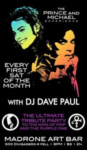The PRINCE AND MICHAEL EXPERIENCEJoin us as Prince and Michael Jackson fans go toe-to-toe on the dance floor. We mix album cuts, remixes, rare tracks and classics from our extensive music collections to battle it out on the turntables. 5 hours of music with no song repeated and no cover songs played. That's how we do it!