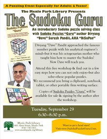 The free Sudoku Guru seminar will take place Tuesday, September 29 from 6:30 to 8:30 p.m. at the Menlo Park Library, located at 800 Alma Street. For people who are interested in having a copy of Mr. Pandit’s book, those will be available for purchase and signing after the event. For event details, visit http://www.menlopark.org/library.