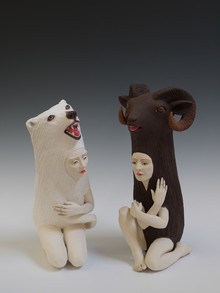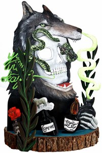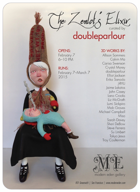 Modern Eden Gallery is excited to welcome gallery favorites, Doubleparlour as curators for their upcoming exhibit, “The Zealot’s Elixir”. All work for this exciting exhibition is sculptural in a variety of mediums including ceramic, resin, wood, and found objects. The impressive roster of artists includes international artists as well as many from the thriving local Bay Area community. They were chosen by Doubleparlour because of their work holds emotional and intellectual qualities that engage the viewer, as well as a commitment to perfecting their craft. The theme of the show is based false prophets and snake oil. The artists each present a unique interpretation on this theme that embodies trickery, faith, hope, and lies.About the Curators: Founded in November 2007, Doubleparlour is Ernie and Cassandra Velasco. They are a husband and wife artistic duo living in San Francisco, CA. Cassandra has a B.A. in Fine Art from Humboldt State and Ernie is a self taught artist. Doubleparlour’s work includes solo and collaborative pieces in a variety of mediums and materials. They strive to produce well-crafted artwork with an emphasis on peculiar, humorous, and melacholy characters.