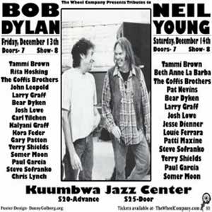 Join The Wheel Company as they present musical tributes to legendary artists Bob Dylan and Neil Young at Kuumbwa Jazz. The December 13 concert focuses on Bob Dylan and features performances by Tammi Brown, Rita Hosking, The Coffis Brothers, and others. The December 14 concert focuses on Neil Young and features performances by Pat Nevins, Bear Dyken, Josh Lowe, and more.More Info