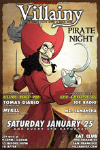 Ahoy thar, mateys! Saturday, January 25th be Villainy's PIRATE NIGHT, and we welcome all buccaneers and landlubbers! Belly up to the sandbar for a tankard of ale or fine spirits, and shiver yer timbers on two dance floors!Villainy is the dance club with a dark side. In the back room, it's a non-stop dance party with some of San Francisco's finest DJs spinning high-energy sets of electro, dance, pop, disco, industrial, house, funk, and whatever else we think will move you. And in the front room, Villainy embraces the dark side, with goth, alternative, and 80s.