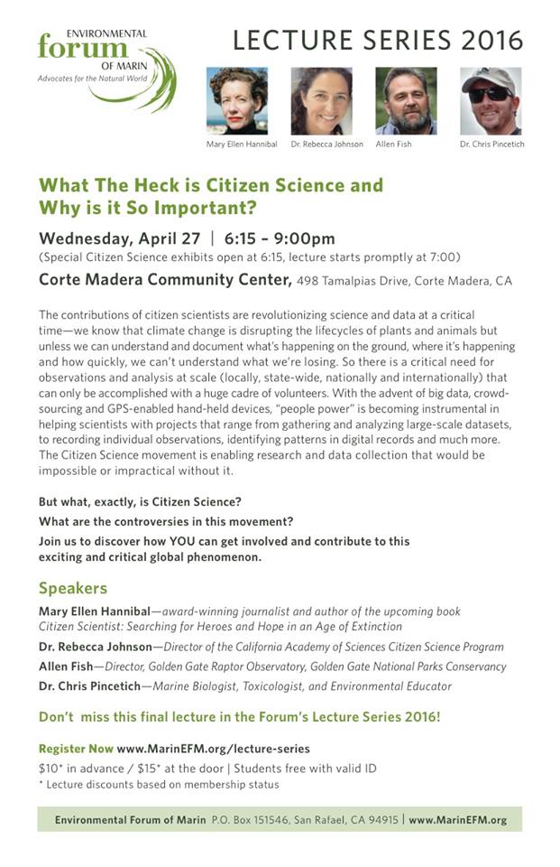 The contributions of citizen scientists are revolutionizing science and data at a critical time. Join us Wednesday, April 27th to discover how YOU can get involved and contribute to this exciting and critical global phenomenon.Wednesday, April 27 | 6:15 – 9:00 PM (Special Citizen Science exhibits opens at 6:15, lecture start promptly at 7:00)