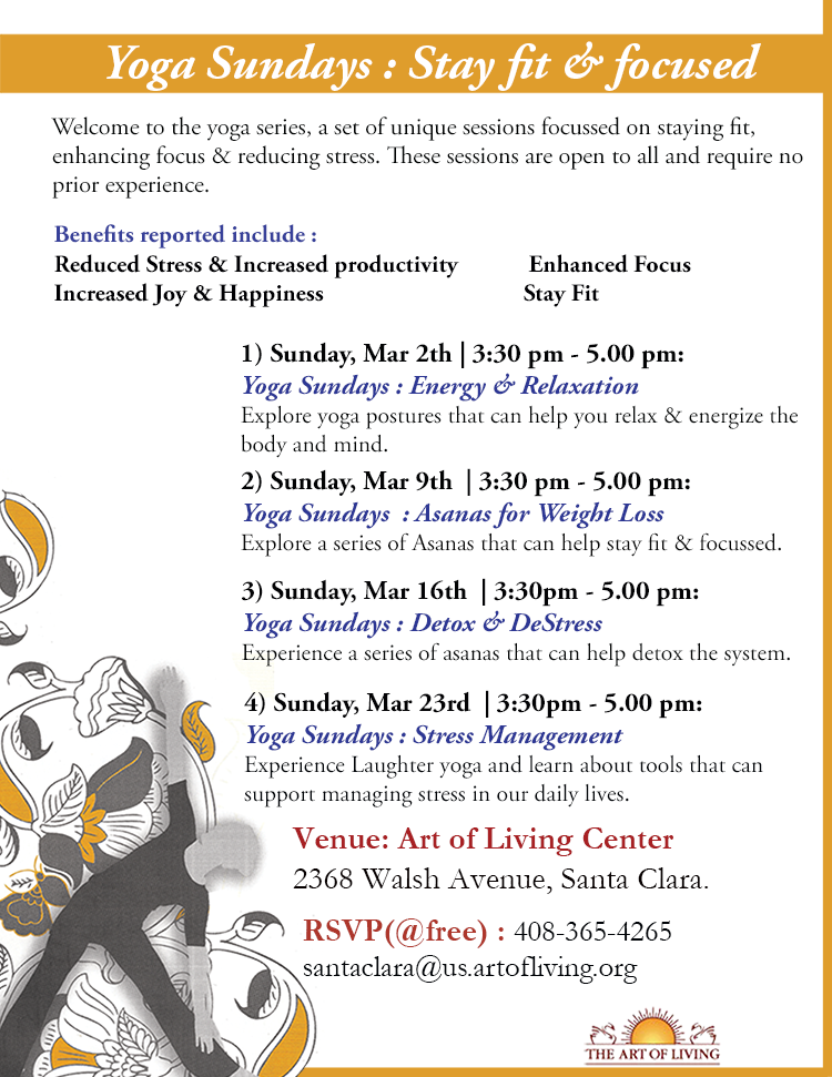 Yoga is very much essential to strengthen the body and relax the mind. It helps remove the restlessness in the body and enhances sleep. There are numerous other benefits of yoga. In this series of sessions, we focus on specific set of postures that help us achieve specific benefits.When: Every Sunday , Mar 2 | Mar 9 | Mar 17 | Mar 25 | 3:30 pm to 5 pm.