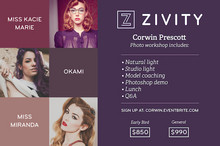 Zivity is excited to host a full day intensive photography workshop with Corwin Prescott! With a classic pin-up theme, Corwin will teach an eight hour workshop about photography, featuring models Miss Miranda, Miss Kacie Marie, and Okami. The workshop will cover natural light, studio light, information about coaching and directing models, and a photoshop demonstration. There will be time allotted in between training sessions to shoot with each model. The end of the class will include a Q&A. Complimentary breakfast, lunch, and coffee will be provided. The models will arrive at 8AM for hair, makeup, and other preparations. Everyone is welcome to attend before class begins at 10AM.More Info